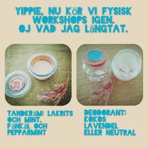 Nästa på tur är skapa giftfri tandkräm och krämig deo. Samt skapa läkande fotkräm av ringblommor och en återfuktande handsprit.