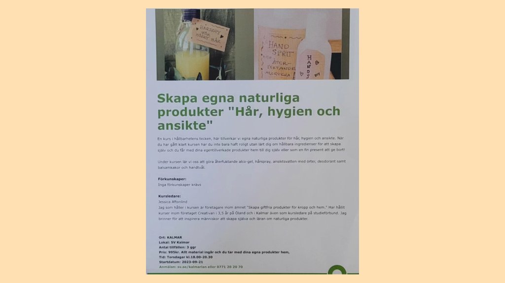 Creativan är i samarbete med Studieförbundet vuxenskolan I Kalmar. En seriekurs där vi fördjupar oss i ämnet giftfri hudvård som du gör enkelt själv.