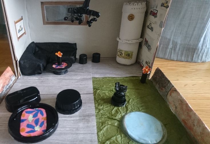 Tittskåp, som vi gör, jag lär ut olika tekniker. Foto:Framsidan på ett hus av skokartong Huset ovan som är utfällt med, grill, plaskdamm, bord m.m Skuggteater, där jag först läser en bok sen gör vi figurer & berättar om eller en ny historia.