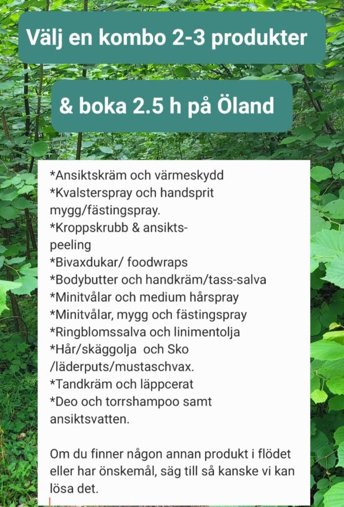 Välj en kombo & boka in dig max 5 personer per gång med undantag på Bivaxdukar 4 personer.Boka i ett meddelande här på första sidan