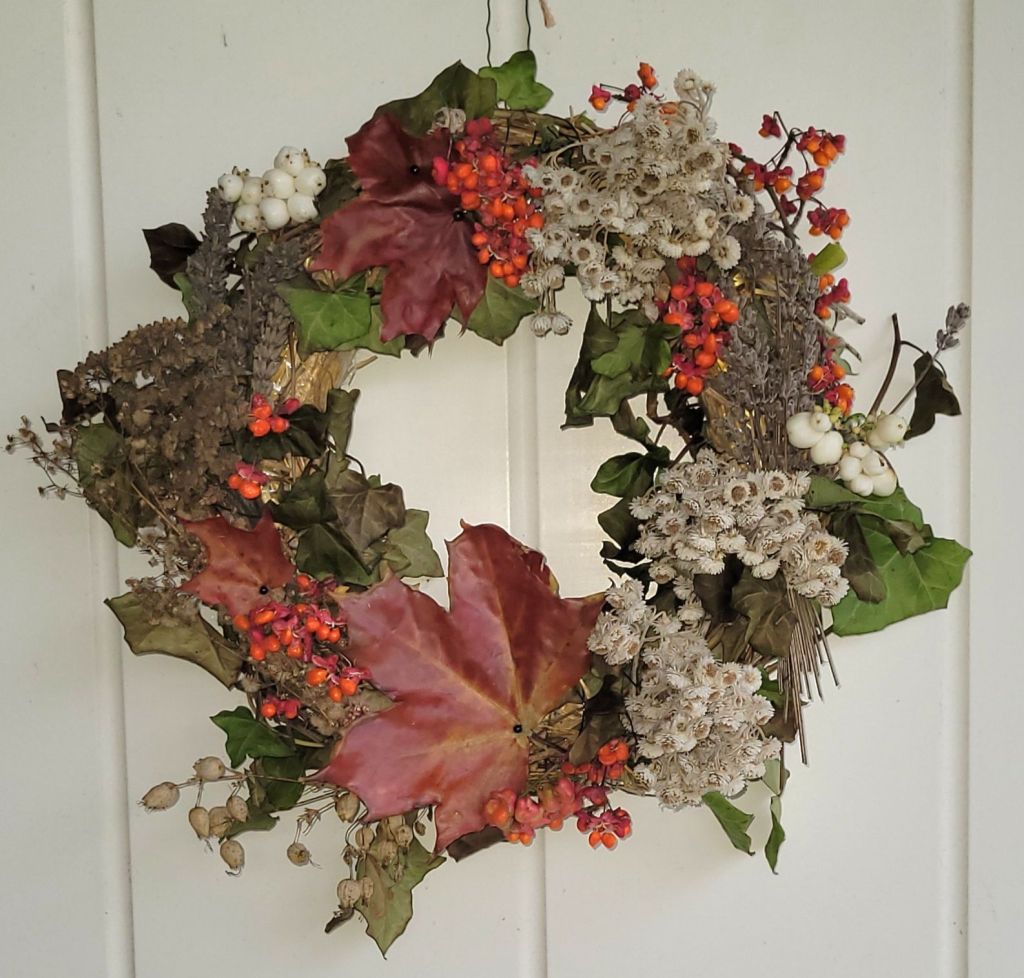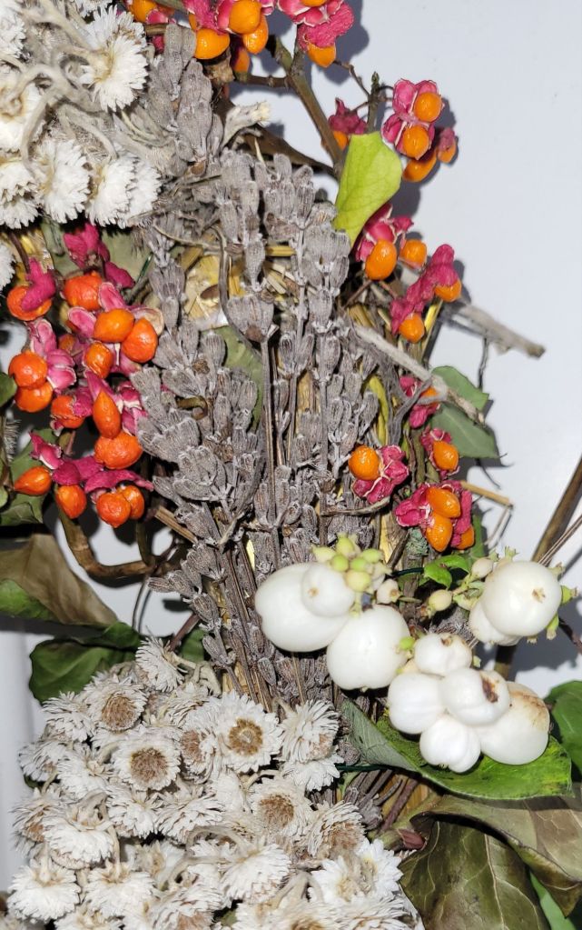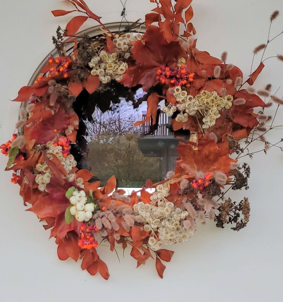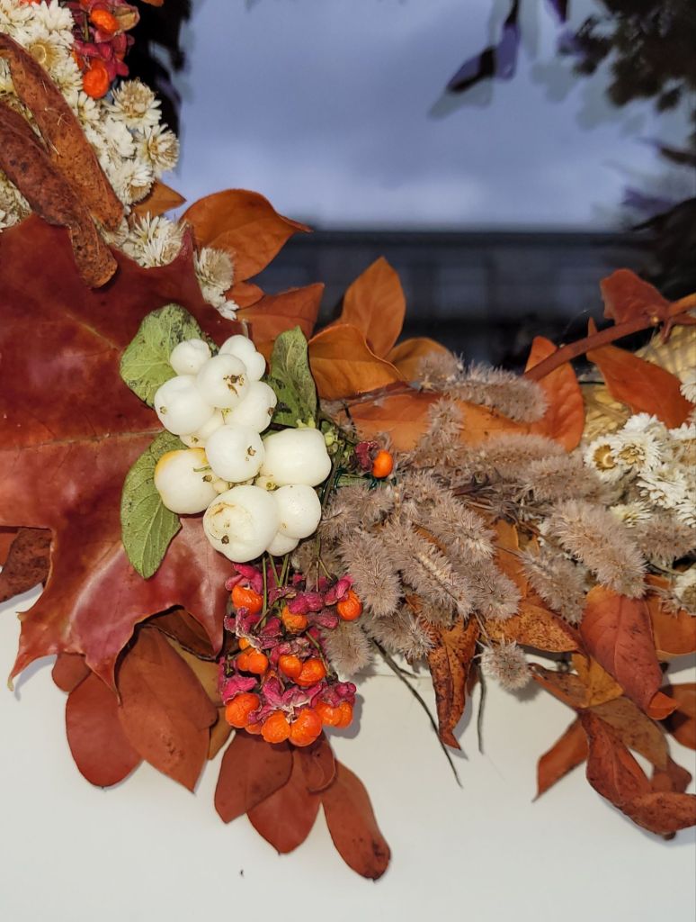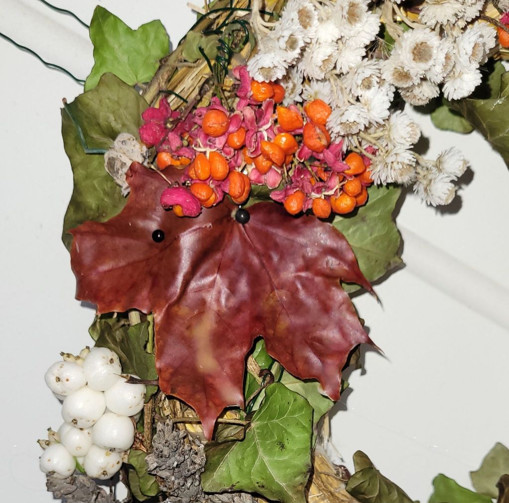 Sen vissnade kransarna, så uppdaterade med färgglada löv, snöbär, benvedsfrukt med mera se följande foton.