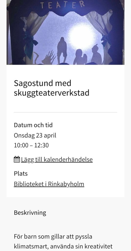 Lyssna till en färgglad saga och inspireras när du sen får skapa egna skuggfigurer och testa i en liten skuggteater.