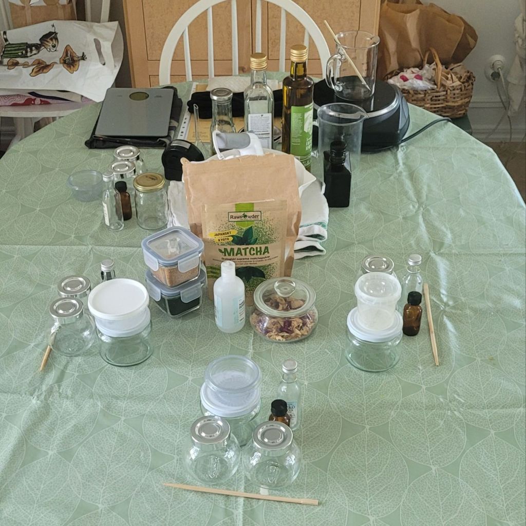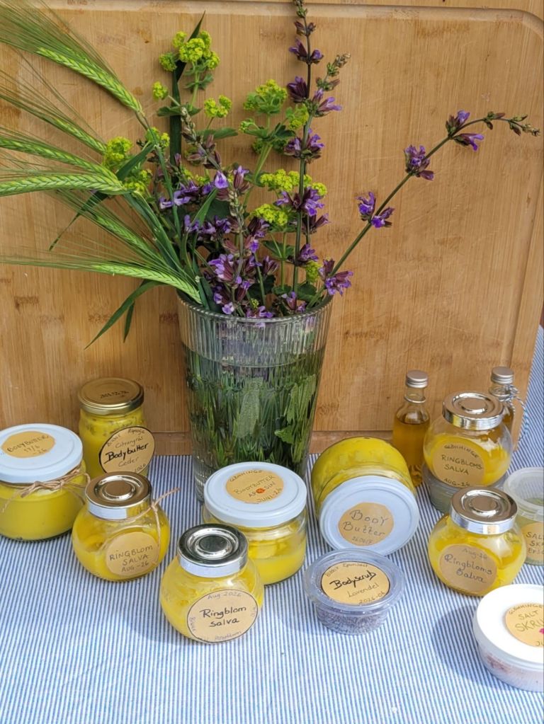 Värdinnan hade plockat, daggkåpa, säd och nån lila växt. 🐝 Tack bina, ni har gett oss blommorna och bivaxet m.m Bodybutter blev med citrongräs, atlasceder, geranium med mera. Ringblomssalvan spetsades med lugnande lavendel och annat. Kroppskubb blev med matcha/ epsomsalt eller lanvendelblommor och salt samt rosor, salt och geranium. Tack tack för att du bokade in mig och bjöd på supergod rabarberpaj m.m. Ni var alla super.
