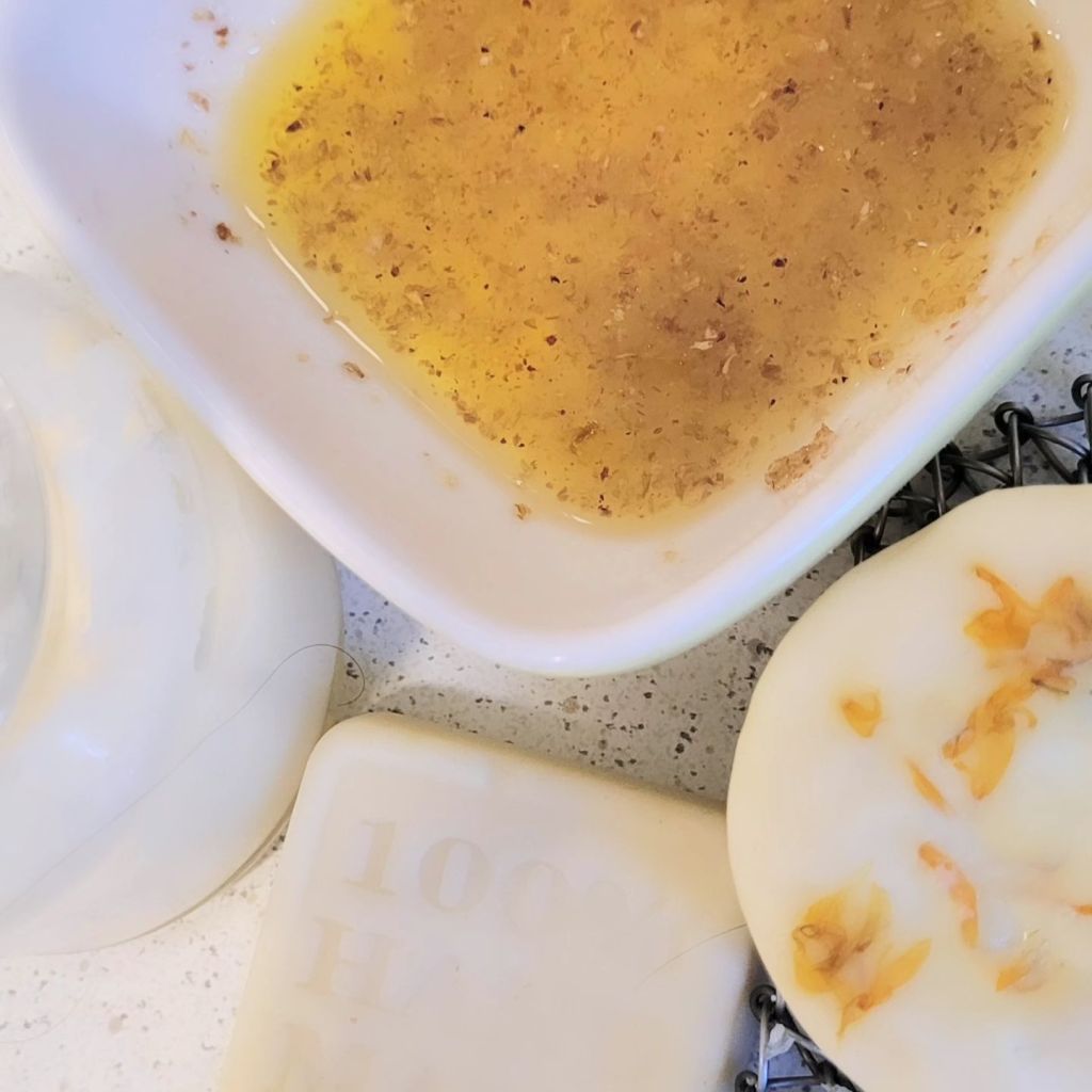 2. Till höger har vi en tvål med talg (för vegan ta kokosolja) från Kalmar län, ringblommor från min trädgård och öländsk rapsolja och lut m.m