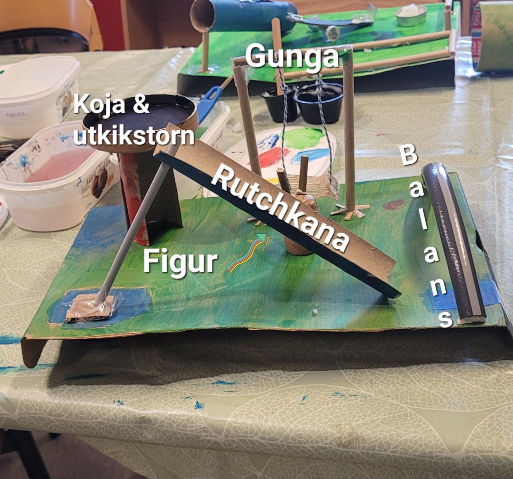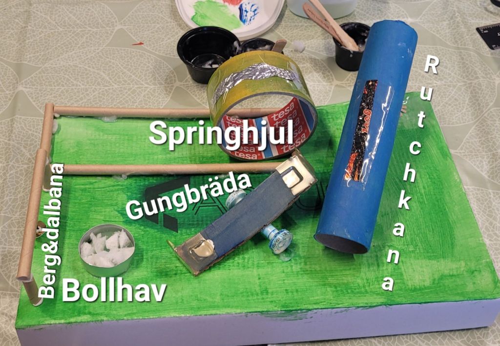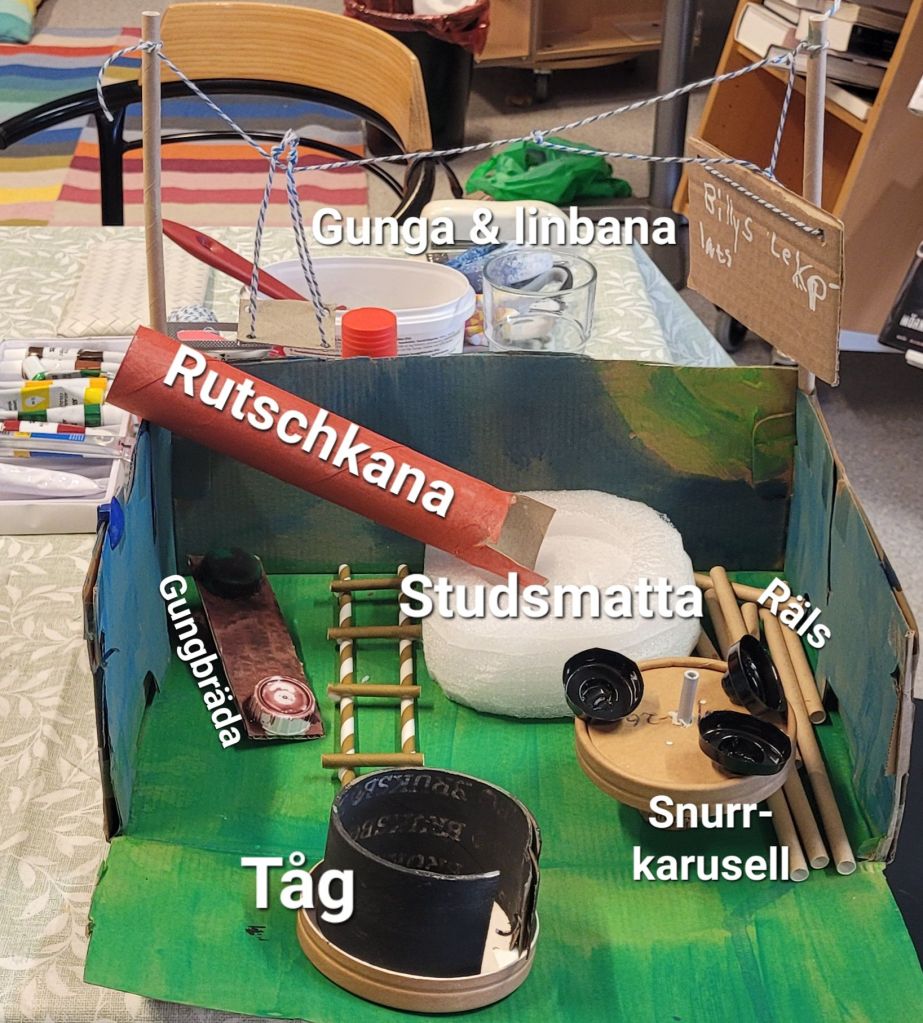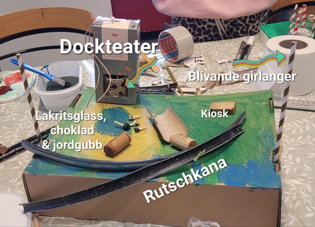 Sen försökte vi som Rolle i boken att skapa en lekpark eller enklare tivoli, jag hade samlat på mig kartong, plast, rör, korkar, pinnar med mera. Det ingick även att färglägga med akryl.