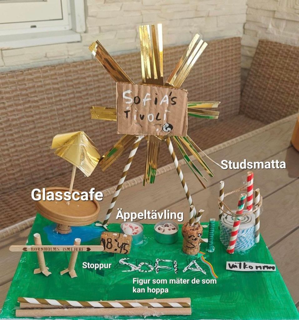 Stegen ska upp på utsidan, rälsen ligger till höger och tåget är på gång samt snurrkarusell kräver lite lim. Oj vad mycket de hann ändå på 1.5 h pyssel exkl. Fikapaus och lässtund. In progress..alltså så gulliga glassar av tändstickor och häftmassa. Rutschkana på gång, oj vad han kämpade med sin dockteater och dylikt.I bollhavet fins även vatten, vad kul. Figuren passade perfekt i rutschkanan, han var bara lite blyg för fotografering. Grunden färdigmålad, alla valde en grön färg med inslag av blått. Min modell som lite inspiration för barnen. Det var fritt fram att skapa precis vad som inom ämnet. Sofia hade skapat tivoli i skolan, men oj så kreativ.