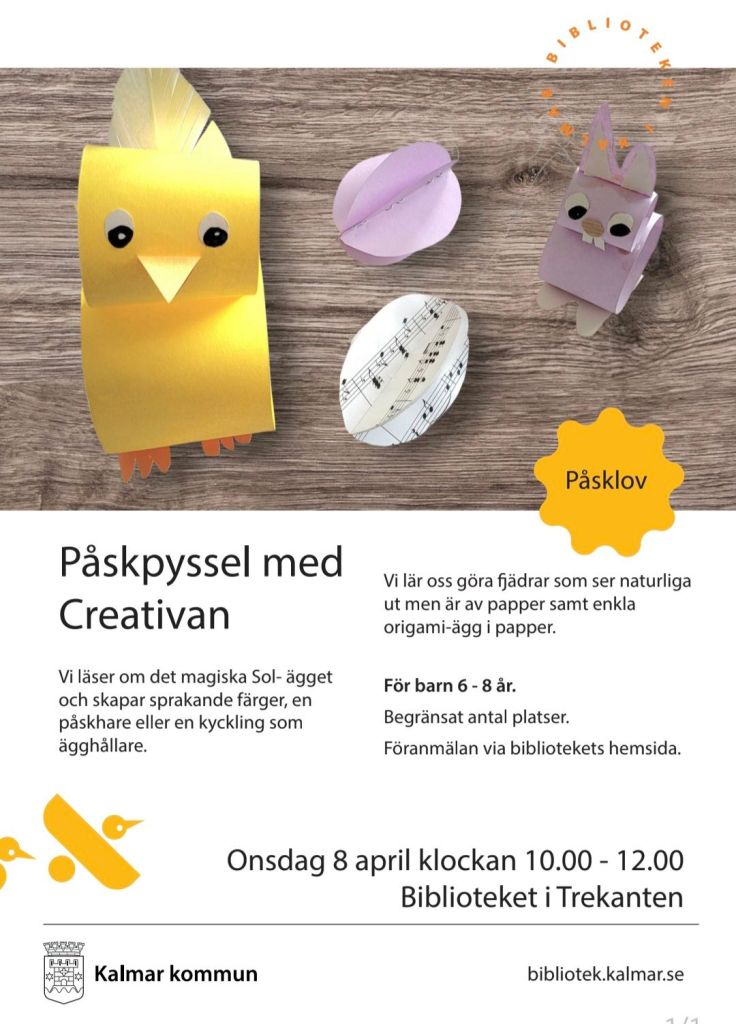 Känner du någon som vill göra något mysigt under påsklovet ? ( gratis aktivitet inkl. fika ) På Trekantens bibliotek kör jag ”Creativan” en cirka 2 h workshop för barn. Först läser vi om ett magiskt ägg sen pysslar vi, finns mallar till ägghållare i form av en påskhare eller kyckling, pappersfjädrar och enkla origamiägg att skapa.